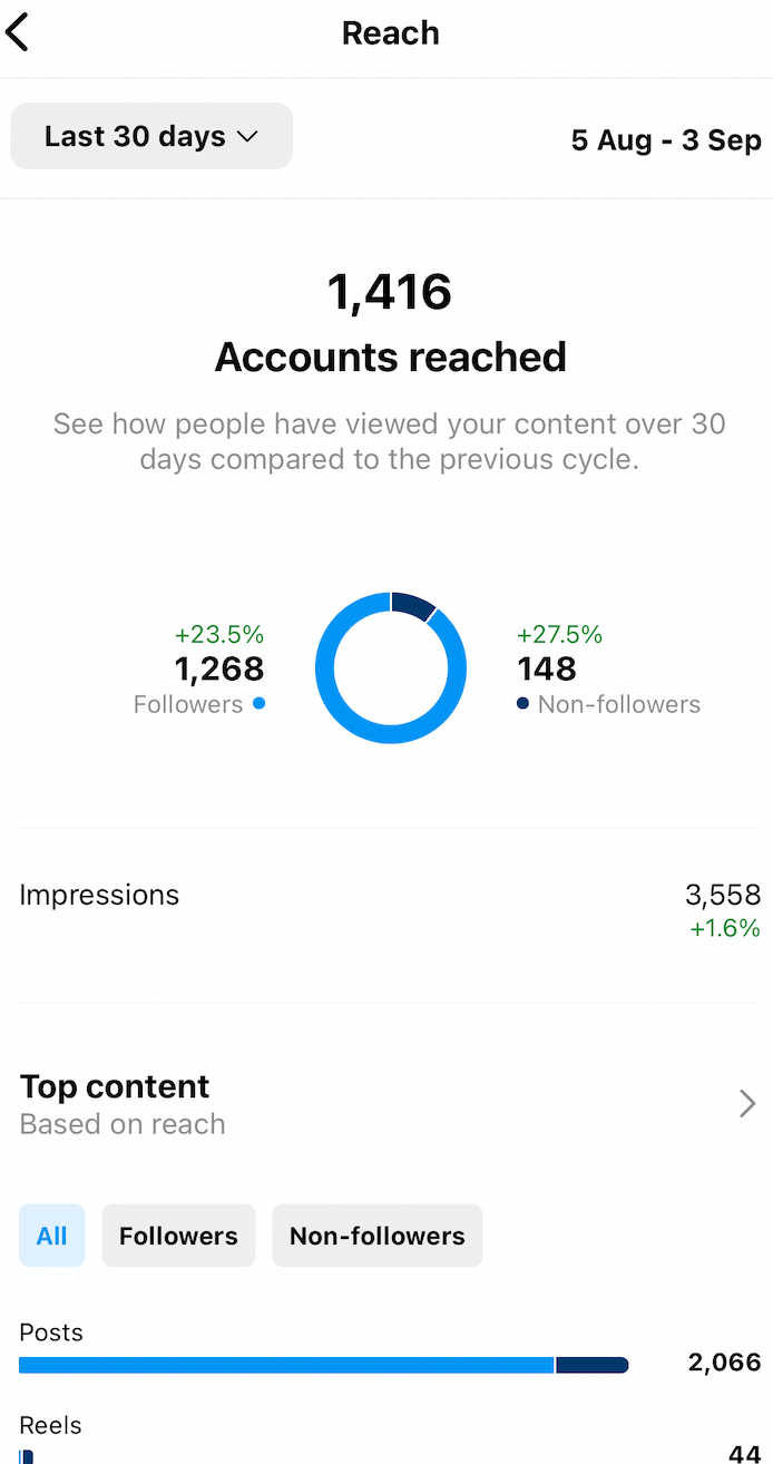 When you view “Accounts engaged,” you’ll see the total number of people who have interacted with your content over a specific time period compared to the previous time period. Instagram breaks this number down by followers and non-followers.