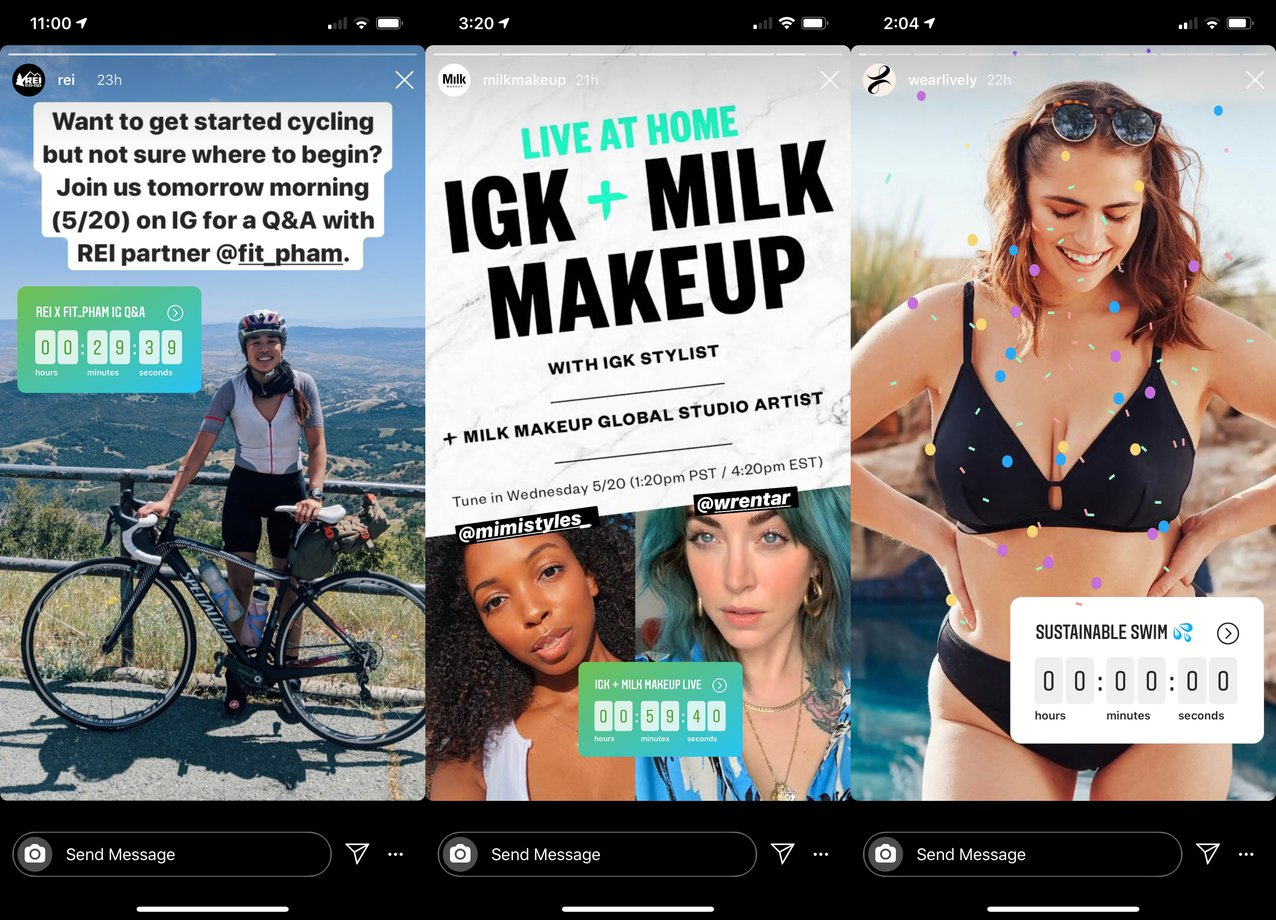 But they don’t have to be used exclusively for major announcements. Many brands — including REI, Milk Makeup, and Lively — use countdown stickers to tease upcoming Instagram Live events, providing users with fun reminders to mark their calendars, so they don’t miss out.