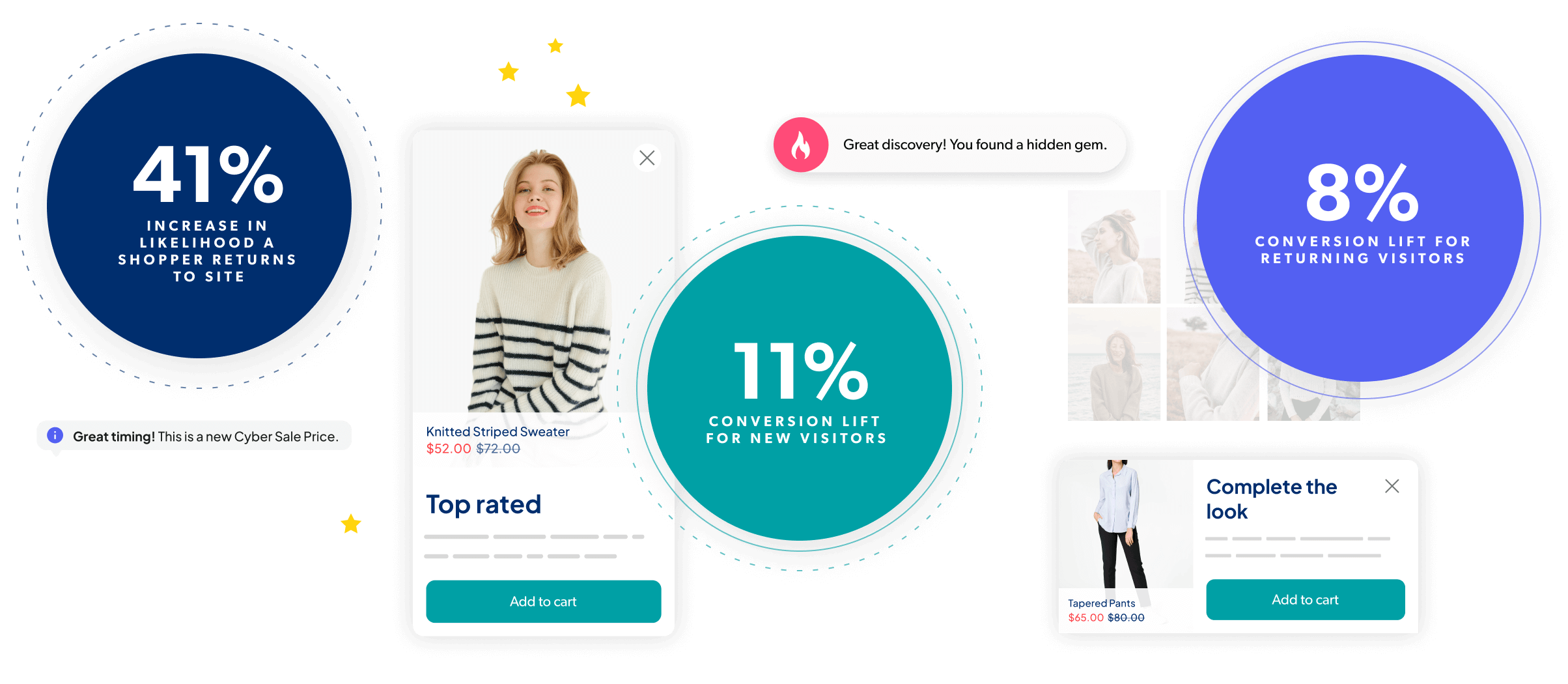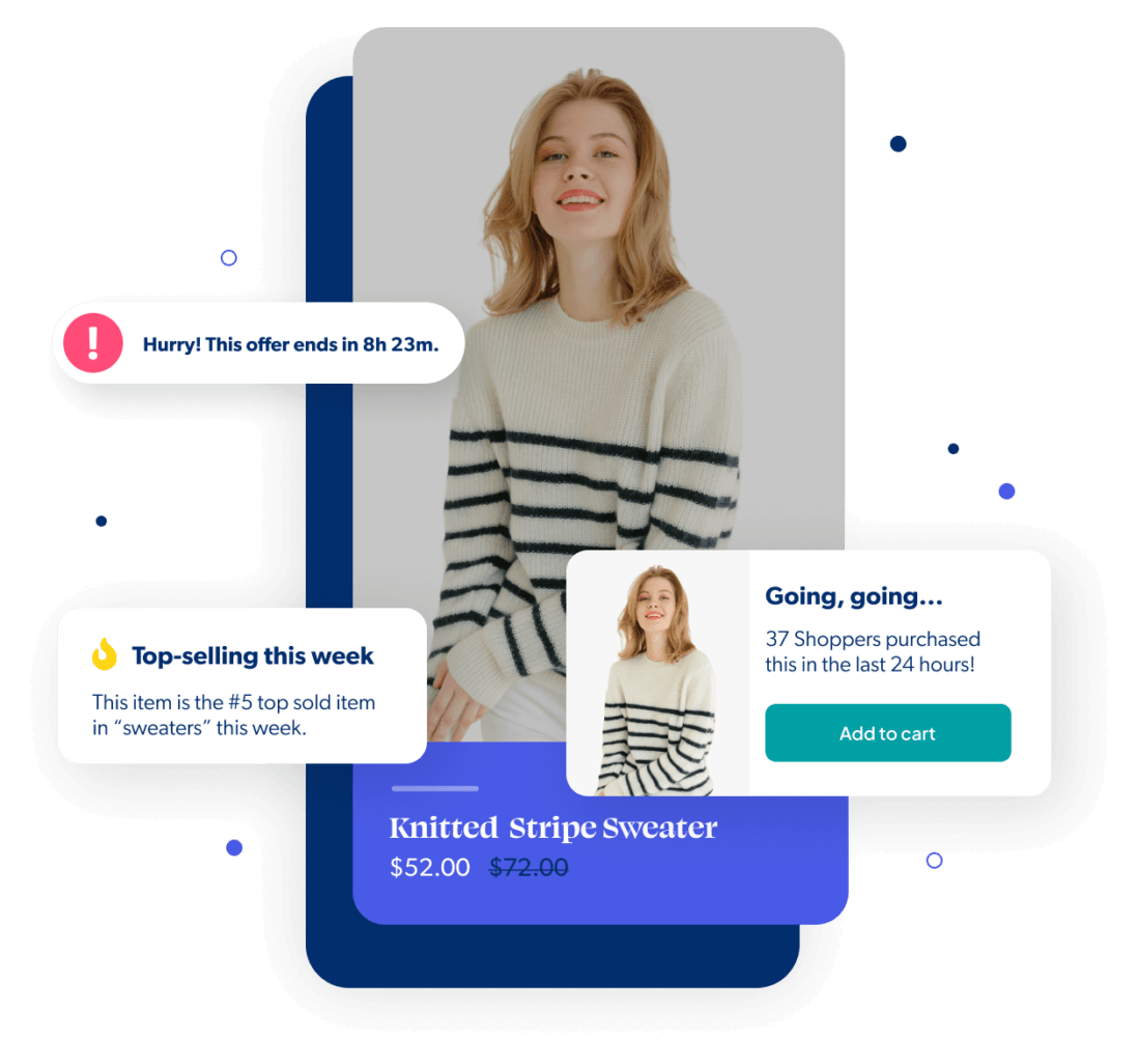 Deliver perfectly timed, intelligently tailored shopping experiences that delight shoppers, leverage social proof, and drive urgency, all while boosting incremental sales from your website traffic.