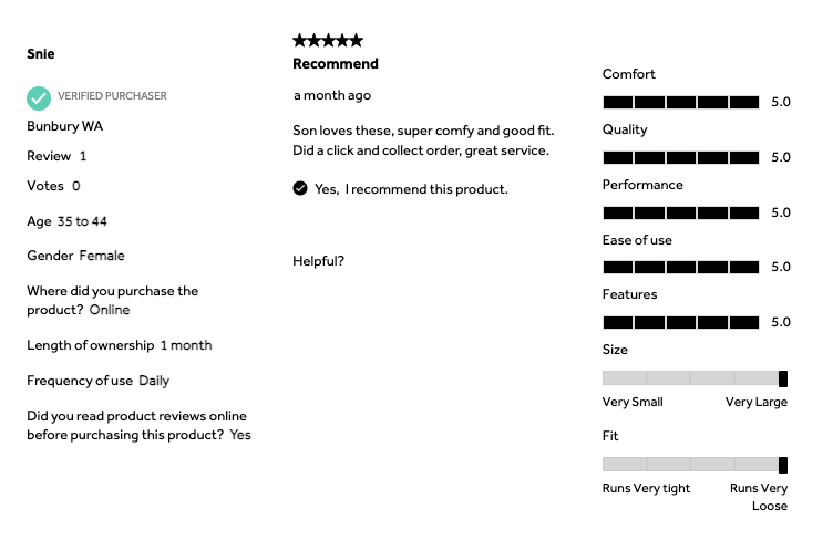 Rebel encourages team members to leave reviews on product pages and write in a more natural and engaging way than the standard brand copy. Rebel and Bazaarvoice showcase these reviews higher up on product pages and add a special symbol to them to signify they were left by Rebel experts.