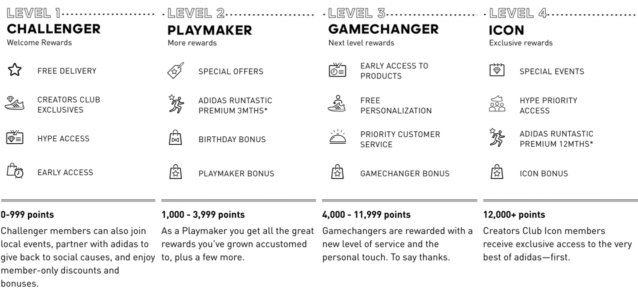 The Adidas Creators Club is a membership-based rewards program. It’s a genius model that rewards customers for engaging with their brand. Members earn points by creating an account, completing their profile, reviewing products, and participating in Adidas training sessions and events. As members earn more points, they are eligible to advance to the next club tier.