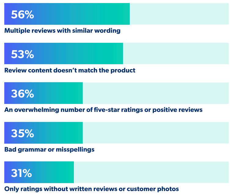 Nearly all shoppers (97%) say fake reviews make them lose trust in a brand, according to our research of 10,000 global consumers. That’s significant because 81% of shoppers also say they’d never use a brand again after losing trust in it. And they’re getting better at spotting fake reviews: