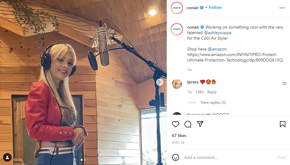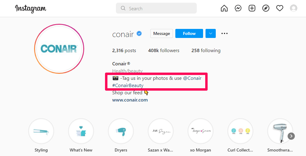 You should encourage everyday users to drive brand engagement through user-generated content (UGC). When your fans want to find you or share their UGC, make it very simple to do so by posting your branded hashtags in your bio, as Conair does.