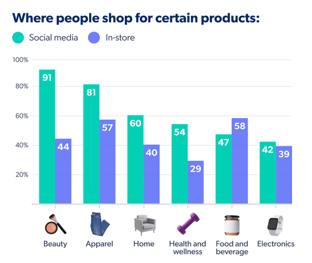 It’s especially prevalent for the beauty and apparel industries. We recently surveyed over 14,000 global consumers to find out how they’re shopping on social. For every industry (apart from food and beverage), consumers are shopping more on social media than in-store. But for beauty and apparel, the homes of fashion influencers, social media is overwhelmingly the favorite.