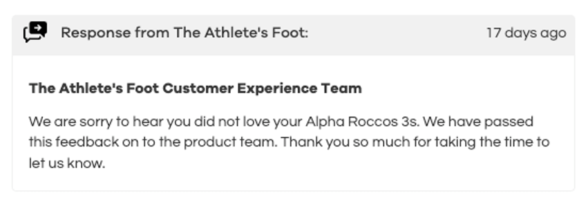 For example, The Athlete’s Foot team can pinpoint any issues with a product and share that feedback with the product team. There’s also the ability to respond to customer reviews to give them assurance that The Athlete’s Foot team will address any problems. Since 89% of customers say they’re likely to shop with a business that replies to customer reviews, that’s a powerful feature for the brand to leverage, especially when it comes to building authenticity.