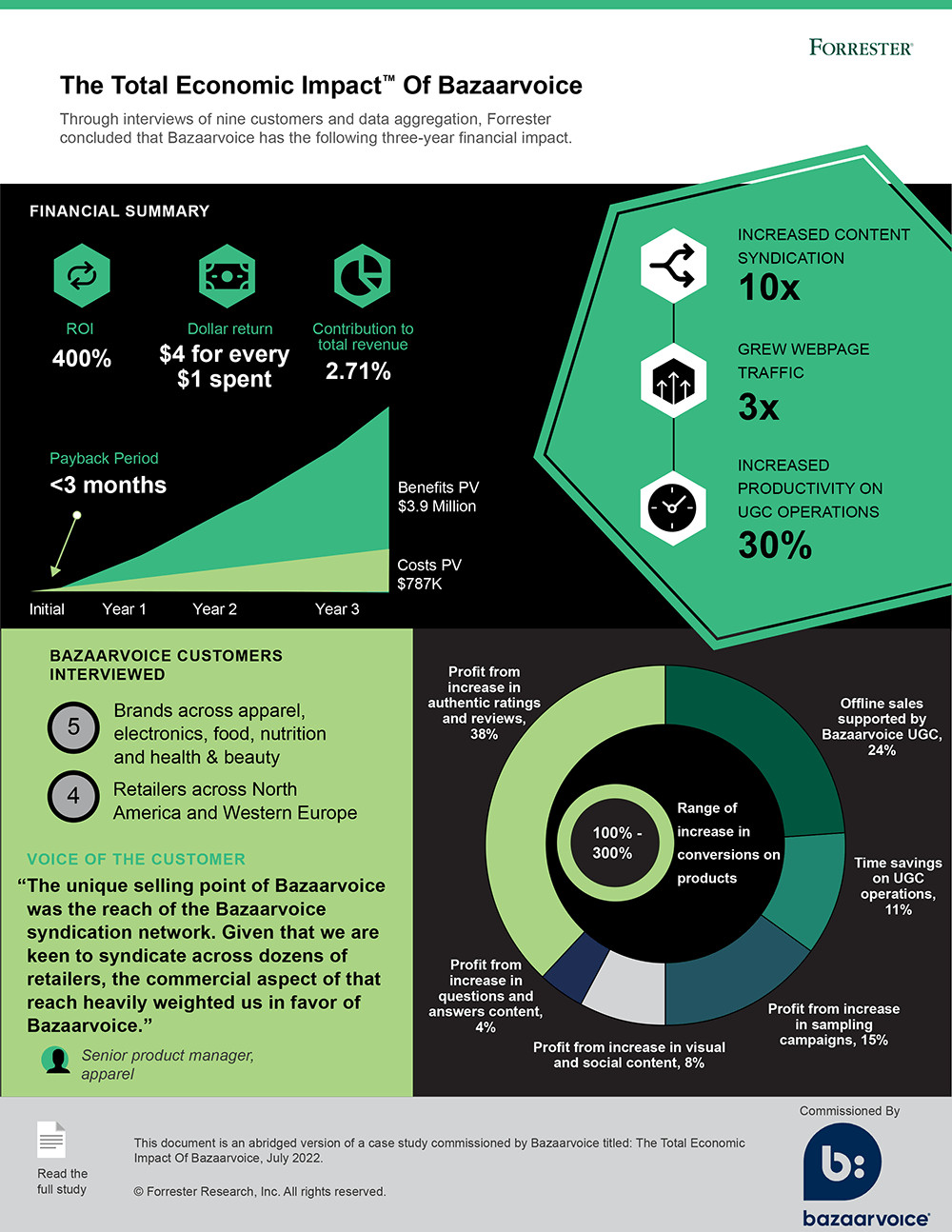 According to this independent study conducted by Forrester Consulting commissioned by Bazaarvoice, you have the potential to deliver 400% ROI, increase conversion rates up to...