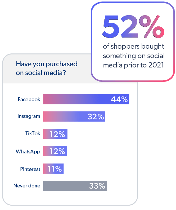 Le commerce social offre le confort d’utilisation que recherchent les consommateurs, et ils en profitent. Plus de la moitié (52 %) des consommateurs ont fait un achat sur les réseaux sociaux avant 2021, les Espagnols arrivant en tête (68 %), suivis des Français (56 %).
