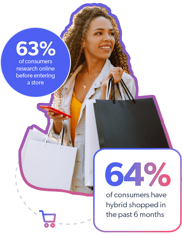 De plus, 64 % des consommateurs affirment avoir eu principalement un mode de consommation hybride au cours des six derniers mois et 63 % des consommateurs effectuent des recherches en ligne avant de se rendre dans un magasin.