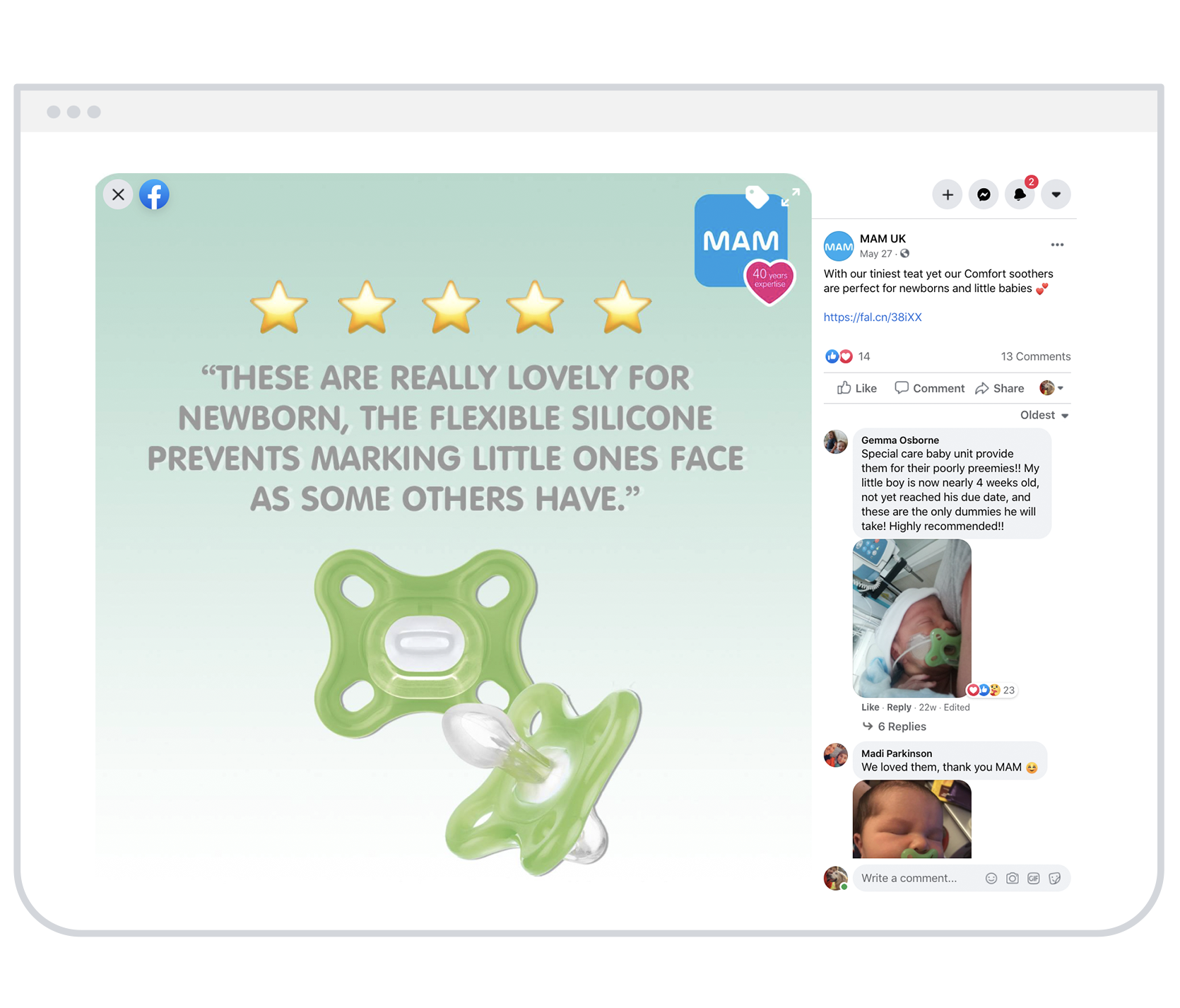 Nobody gives better advice to parents than other parents. That’s why user-generated content (UGC) is so important to MAM’s e-commerce success. To stay ahead of other baby brands in a competitive industry, MAM uses UGC to help parents find and buy the right products for their newborns and toddlers. The products may be small—baby bottles, sterilisers, oral care products, and breast pumps—but the amount of effort parents put into these buying decisions is big. Especially for first time parents, which is the majority of MAM’s customers.