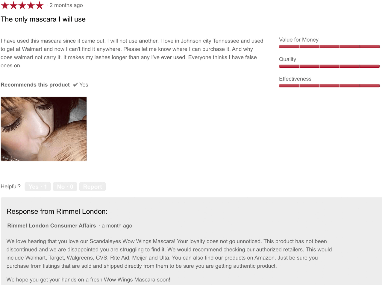 Rimmel London shows all product reviews right below the product description and ‘add to cart’ button on their product pages. The above example shows a customer review with visual UGC and Rimmel’s helpful response to the review, a strategy that led to a 44% sales lift.