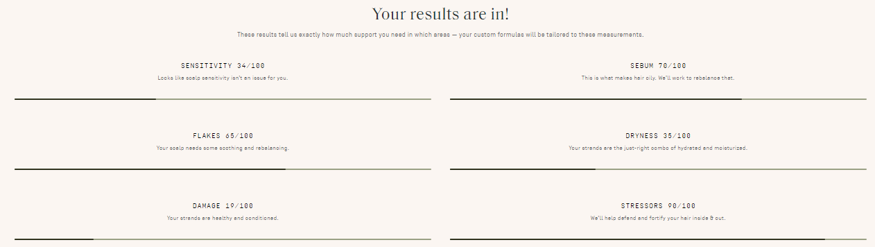 The custom hair care brand Prose bases their entire business model on making personalized recommendations according to each customer’s unique hair type. Their consultation quiz asks a series of detailed questions, some with corresponding illustrations and images, to determine the best hair care routine for each customer. The results show how each respondent scores on different factors that go into making the tailored product recommendations.