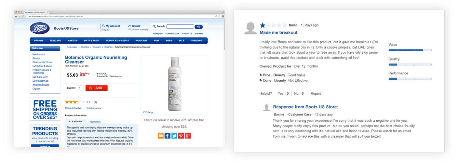 “Responding to negative reviews gives us the chance to shift the way the customer feels toward us based on the way we handle their concerns…we respond to reviews to get involved in a conversation with our customers.” — Bonnie Berrio, Customer Service Specialist, Boots Retail.