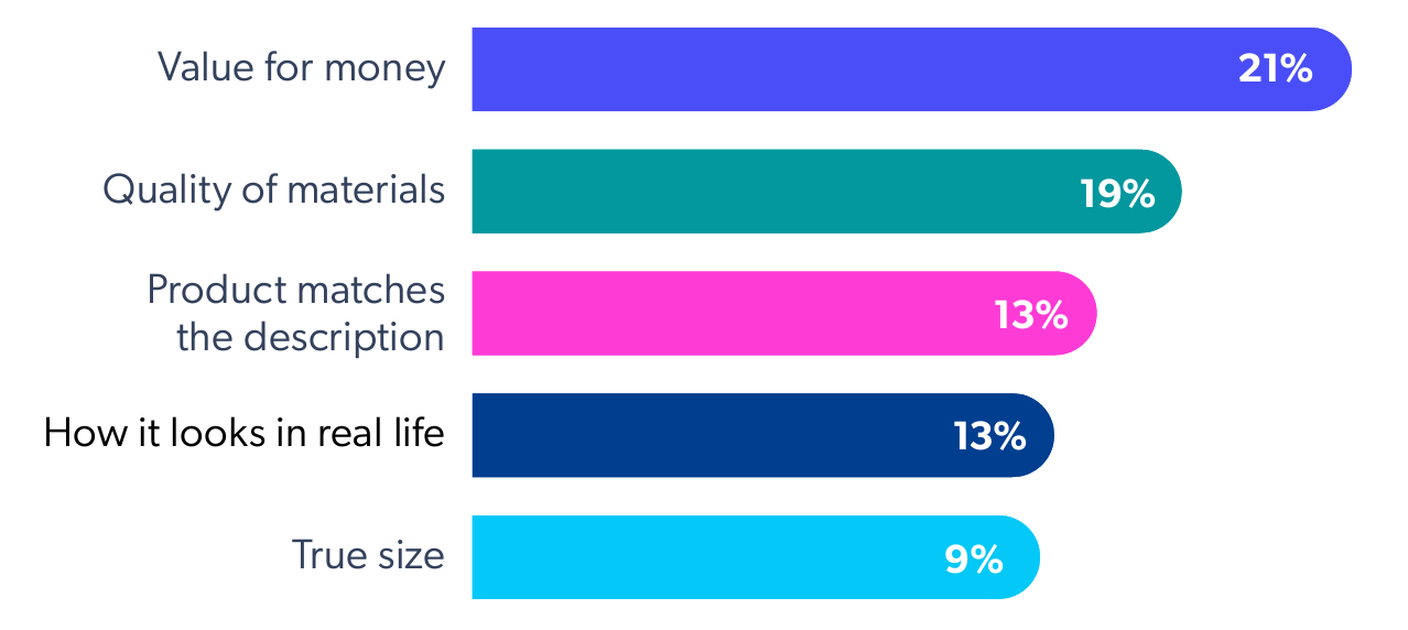 Shoppers are looking for value for money, and review content is where they find it. They want to see information that makes it easier to plunk down their hard-earned cash on a purchase. And value doesn’t just mean price — they want to know the product quality is worth the cost, too. 62% of shoppers are looking for information that validates the item is worth the money and 59% want to confirm it’s of high quality, according to our Shopper Experience Index.