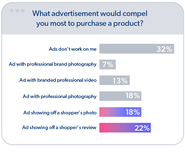 According to the Bazaarvoice Shopper Experience Index 2022, an annual report into consumer behavior, 32% of consumers say ads don’t work on them. Instead, they’d rather see content from real shoppers, and find ads featuring a fellow shopper’s reviews and photos more compelling.
