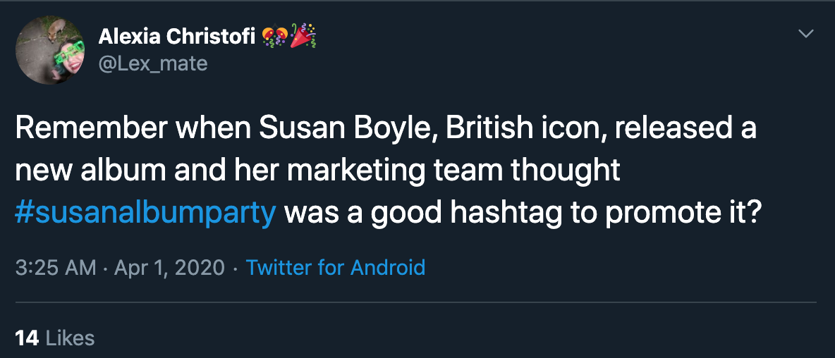 Before launching your hashtag contest, consider any way a hashtag can be misconstrued when words are strung together. Take, for example, the hashtag used to promote singer Susan Boyle’s album release in 2012: #Susanalbumparty. It was meant to be Susan Album Party, but you probably see what the rest of social media saw. Twitter users continue to discuss the unfortunate hashtag today.