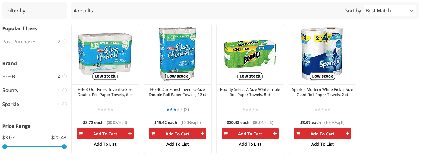 There’s nothing more frustrating than loading up your online shopping cart only to realize the items actually aren’t available at the store for pickup. Retailers need to work to ensure that inventory is available when shoppers order via BOPIS to keep them coming back. At a time where it’s difficult to find toilet paper or dumbbells, shoppers want to know that the items they’re selecting will be in their bag upon pickup. For example – Texas grocery retailer HEB only shows products available in their store when you place an order online for pickup, and they badge items that are low stock.