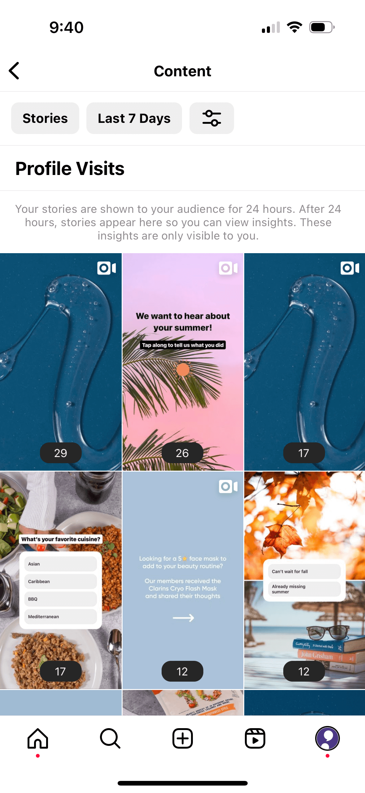 At the bottom of your story insights dashboard, you’ll find data on your profile activity. This includes the following metrics: