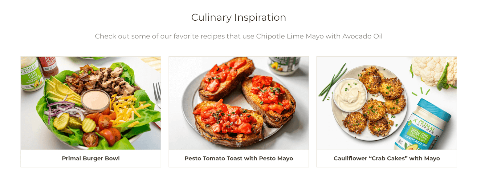 Primal Kitchen uses its product pages to reduce the risk of ordering pantry staples online. On the product page for the brand’s Chipotle Lime Mayo, Primal Kitchen has a short product description that details how the product tastes compared to regular mayo and gives suggestions for foods to use it on.