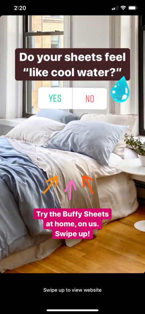 But product stickers aren’t the only way to promote shopping in your Stories. You can also use poll stickers to hype up an item and link directly to the product page using a Swipe Up, like bedding brand Buffy does in the example above.