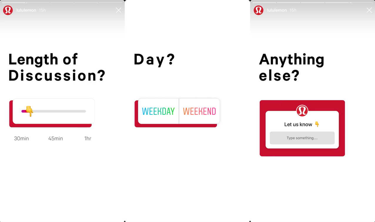 And in this example from Lululemon, the athletic apparel retailer employs Instagram Stickers to get feedback from its audience. Following the conclusion of its first book club meeting, the brand seeks ways to provide a better user experience that’ll get more of its followers involved.