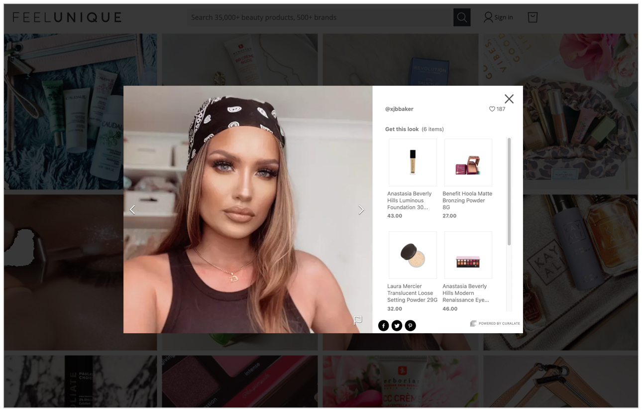 Feelunique utilise Bazaarvoice comme solution de social commerce pour créer de l’engagement. Avec Galleries, la marque collecte les posts et photos générés par les consommateurs sur les réseaux sociaux, puis les affiche sur sa page d’accueil, ses pages produits, ses pages de campagne et dans une galerie pleine page.