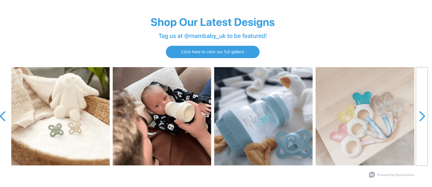 When physical stores temporarily closed for the COVID-19 pandemic and with social media and e-commerce growth MAM increased investments in it’s social and community programs. Bazaarvoice Social Commerce allowed MAM to increase their online presence and get their beautiful products in front of customers at home.