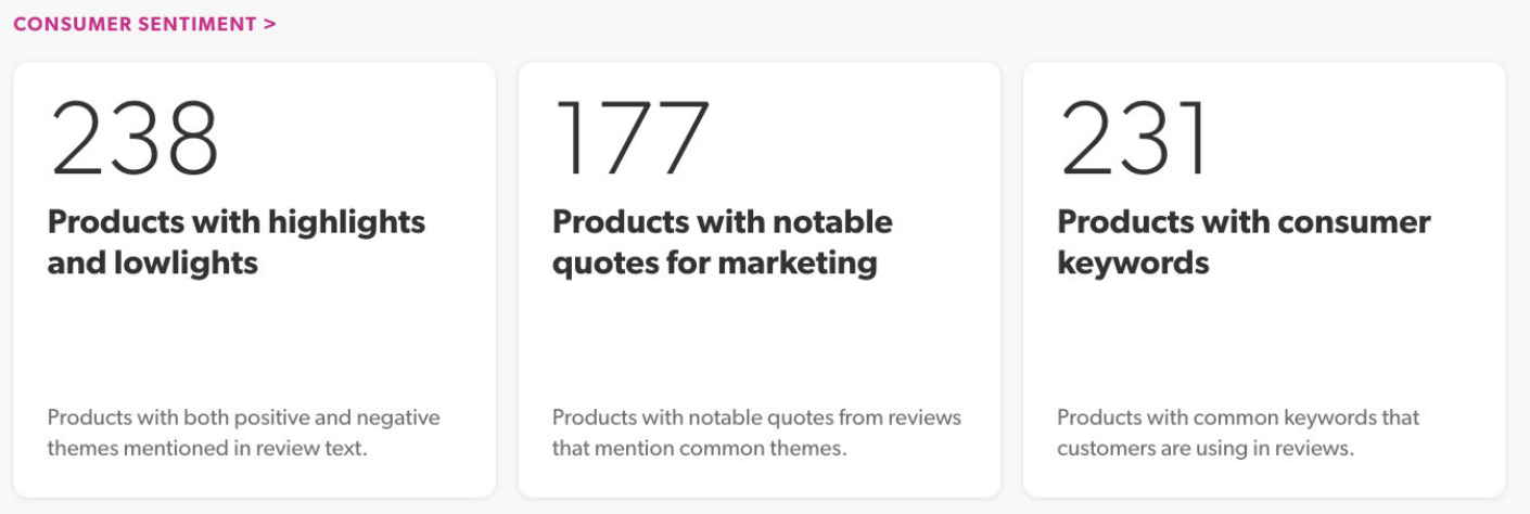 With Bazaarvoice, clients can easily access customer sentiment insights to identify Products with Lowlights/Highlights and Products with Notable Marketing Quotes. This helps you quickly identify what your customers are saying about the products you sell — especially beneficial for your private label items.