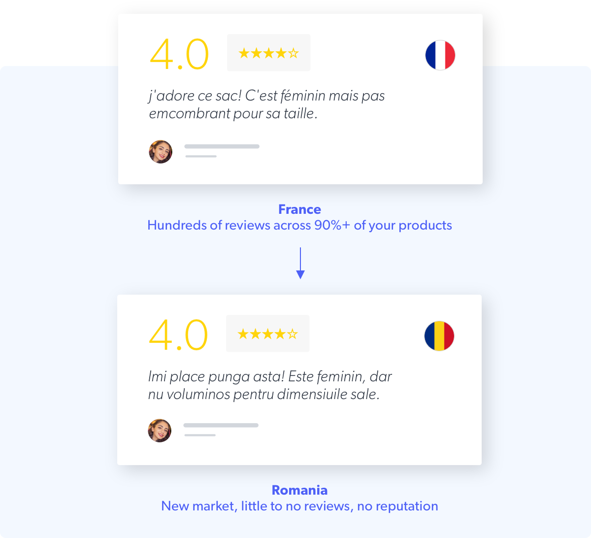 Need to succeed in a new country? Make your user-generated content (UGC) go global to boost sales, conversion, and traffic to your expanded e-commerce footprint. Transcend borders when you translate reviews: take all your customer love from one market, and drive it across any market you grow into. Collect content and increase traffic on an international scale. And syndicate locally relevant UGC across your new larger digital presence.