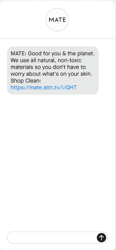 The above SMS example from fashion brand MATE the Label demonstrates its environmental values and commitment to using natural materials. MATE’s SMS program produces positive results in the form of high open rates and engaged subscribers.