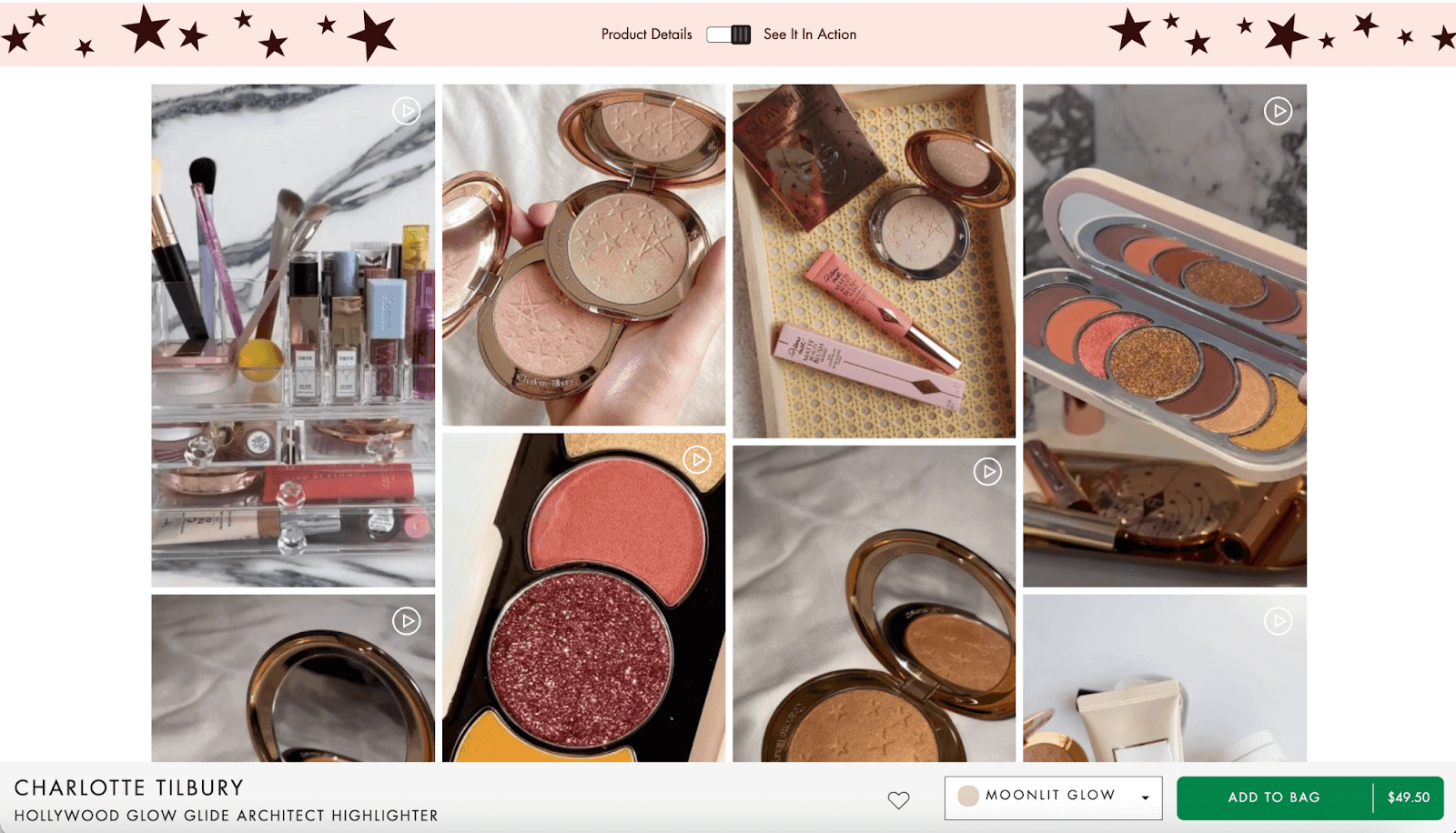 British luxury beauty retailer SpaceNK truly understands how UGC impacts shoppers’ decisions. One of their expertly cool on-site activations lives on product display pages. While perusing a product, you have the option to toggle on a gallery of user-generated Instagram Reels and images to “see the product in action.”