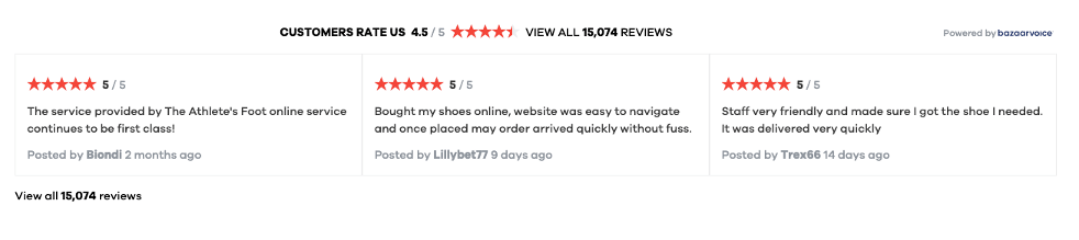 Shoppers like to see ratings and reviews when they’re considering a purchase (aka social proof). In fact, those who interact with UGC are two times more likely to buy. But it’s not always easy to obtain these valuable bits of content, and The Athlete’s Foot realized they needed some help getting their reviews built up online. “The review system we were using before Bazaarvoice, had far too many limitations and didn’t offer syndication,” Pihier said.