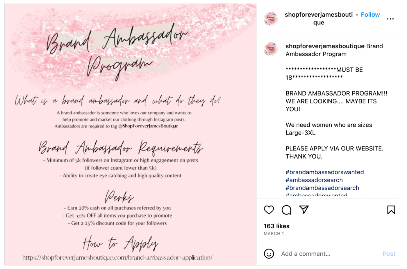 Post about your search on social media pages, like Shop Forever James Boutique, and list the requirements you’re looking for, like minimum follower count. Brand ambassadors are usually rewarded with discounts or free merchandise for their efforts.