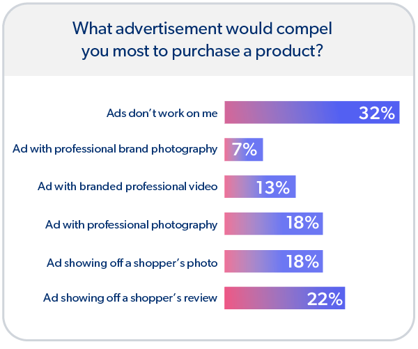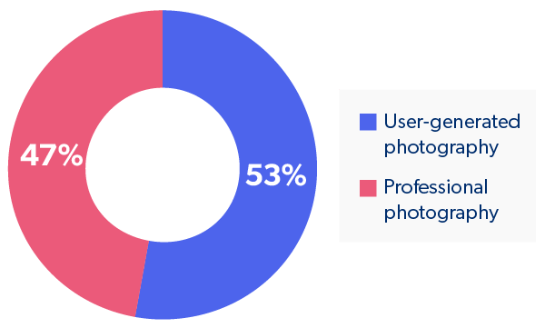 Lorsqu’on interroge les consommateurs sur les images, ce sont celles générées par les utilisateurs qui continuent de gagner en importance. En effet, 74 % des consommateurs s’accordent à dire que les photos d’autres consommateurs augmentent leur probabilité d’acheter un produit. Plus de la moitié (53 %) déclarent que les CGU, comme les images des consommateurs sur les réseaux sociaux, leur inspirent davantage confiance pour prendre leur décision d’achat que les photographies professionnelles. Et 42 % achèteraient un produit ne disposant d’aucune photo professionnelle.