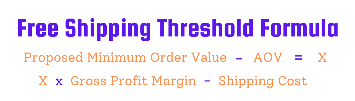 Engage customers and keep deliveries cost-effective by promising free shipping on orders over a certain amount. To calculate the free shipping threshold formula, take the proposed minimum order value and subtract average order value. Then, take the difference and multiply it by the gross profit margin and subtract the average shipping cost.