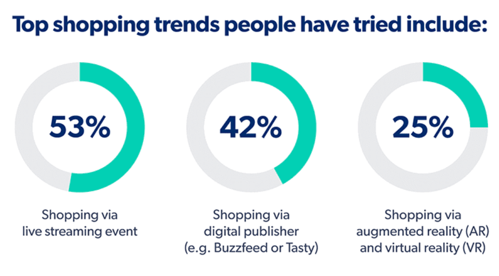 And when we shift back to this survey, we see these are clearly still hot topics. Livestream shopping for example is something shoppers are especially excited about. Live shopping sales are predicted to account for about 20% of all e-commerce by 2026, according to McKinsey.