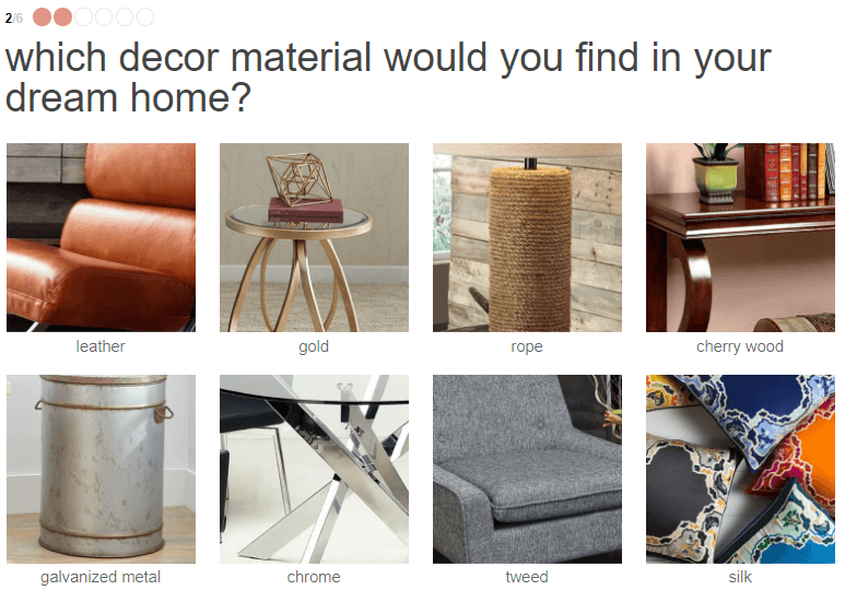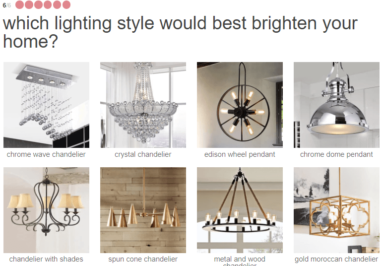Overstock.com’s “What’s your interior design style?” quiz is an excellent example. The quiz asks visitors to pick their favorite images from different design categories, culminating in what their definitive style is.