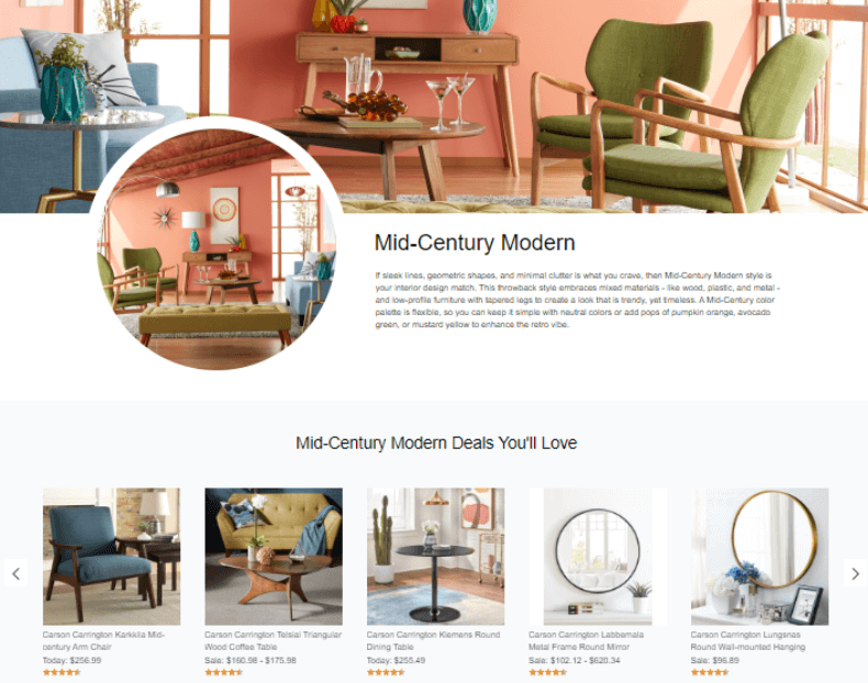When shoppers receive their results, they’re prompted to shop for home decor items and furniture that fit that particular style and aesthetic. Here we have an example of results with product recommendations from Overstock.com’s “What’s your interior design style?” quiz: