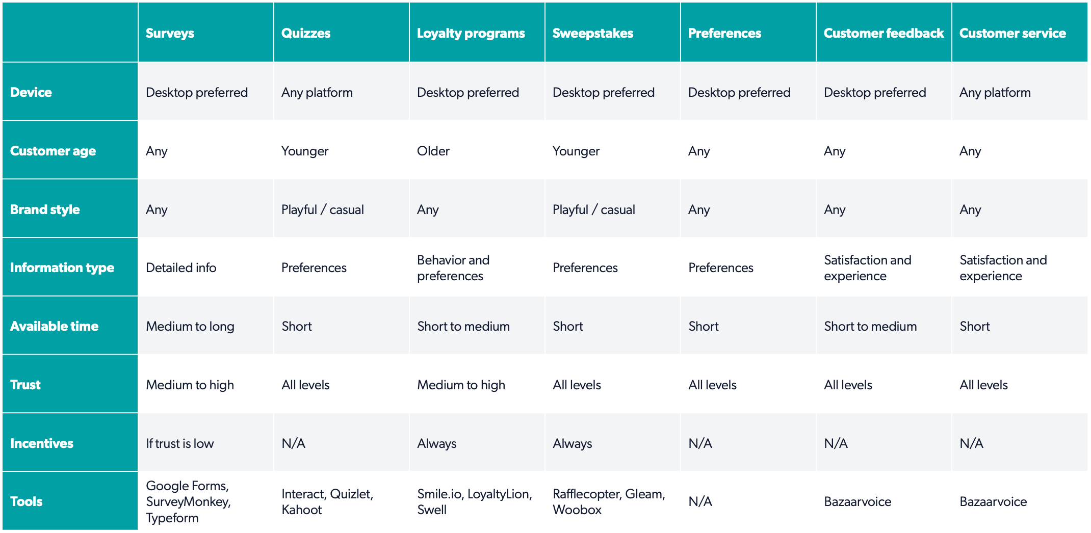 For example, surveys are well-suited for gathering detailed information, while quizzes are good for extracting general preferences quickly. But young people might prefer a fun quiz over a long survey. And someone on a laptop might have more time to complete a survey than a person doing a quick visit to your site on mobile.