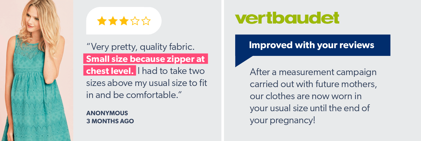 For one maternity line in particular, customers were leaving reviews that the cut was too small. Concerned by receiving the same feedback over and over, Vertbaudet fixed the cut and gained a 12% increase in revenue thanks to the amendment.