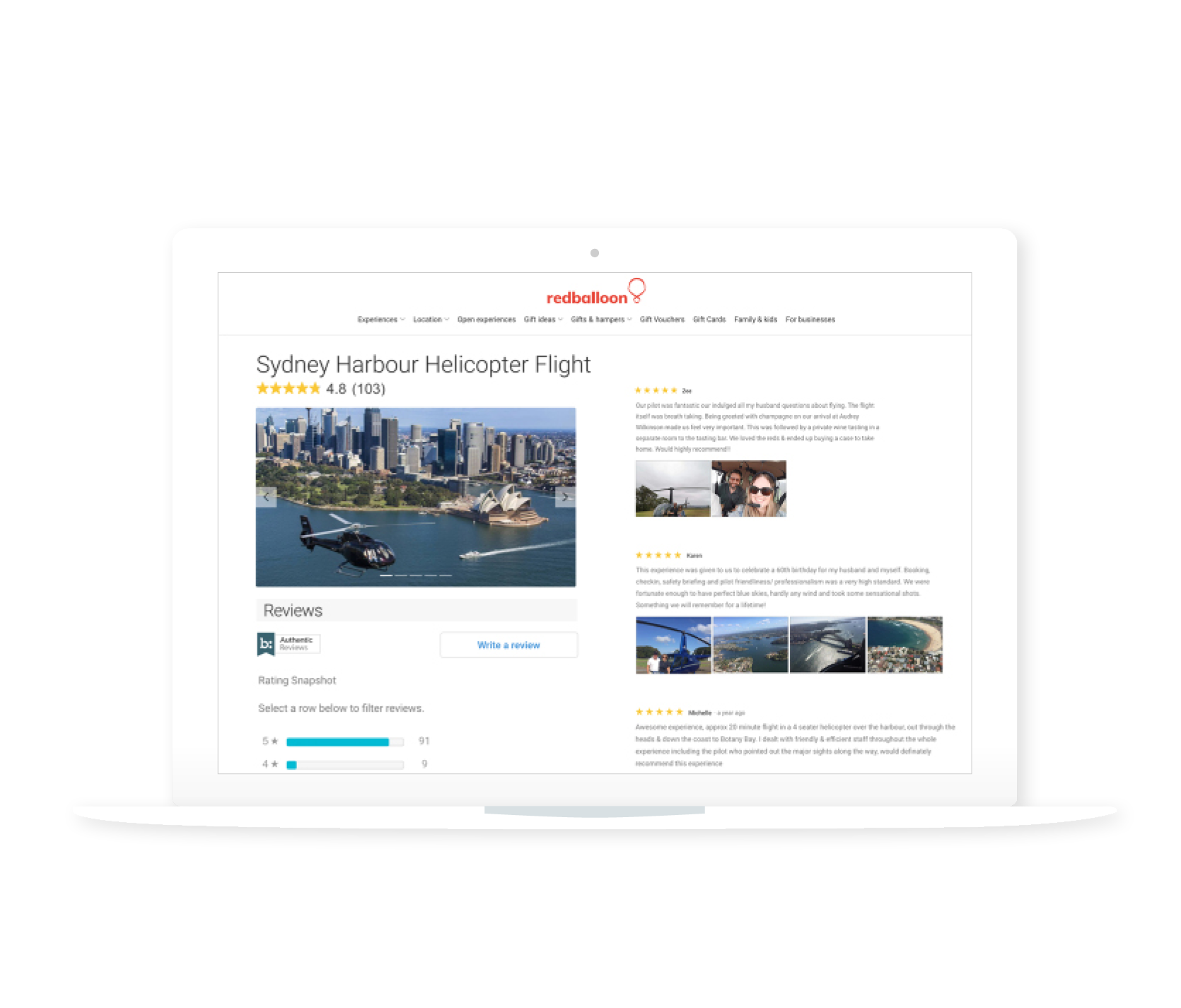 Reviews and photos from customers increases RedBalloon's online conversion rate and average order value by helping site visitors choose the right experience or buy the perfect gift.
