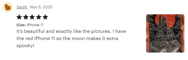 Sharing attribute information about the product (like fit, quality, and comfort) is also a good way to ensure quality UGC. For example, one Etsy reviewer detailed a specific challenge they faced during the time of purchase. Another shared an image of her red phone, so other customers with that same color phone could better visualize the case.